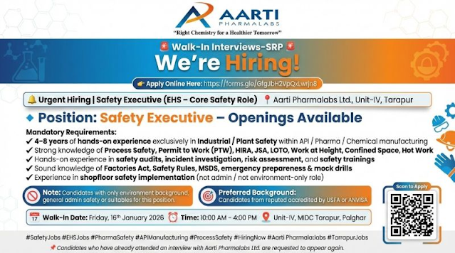 Looking to advance your career in core plant safety and EHS within the pharmaceutical industry? Here’s an urgent and high-value opportunity. Aarti Pharmalabs Ltd is conducting a walk-in interview for Safety Executive (EHS – Core Safety Role) at its Unit-IV manufacturing facility in Tarapur, Maharashtra.