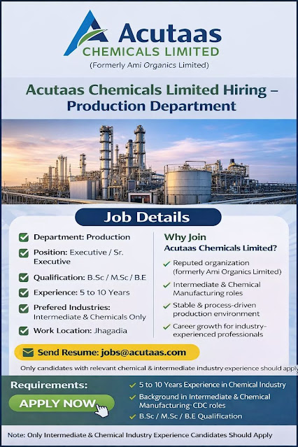 If you have solid chemical plant production experience and want to grow with a process-focused manufacturer, Acutaas Chemicals Limited offers a strong platform in Jhagadia.