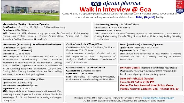 Ajanta Pharma Limited—a Great Place to Work® Certified organization with presence in 30+ countries—is conducting a Walk-In Interview in Goa to hire experienced pharma professionals for its USFDA-approved Dahej manufacturing facility. This drive covers Manufacturing, Packing, Quality Control, Quality Assurance, Maintenance (Plant & HVAC), and Stores/Warehouse roles.