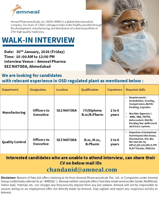 To strengthen its operations at the SEZ Matoda, Ahmedabad plant, Amneal Pharmaceuticals is conducting a Walk-In Interview for experienced professionals in Manufacturing and Quality Control.