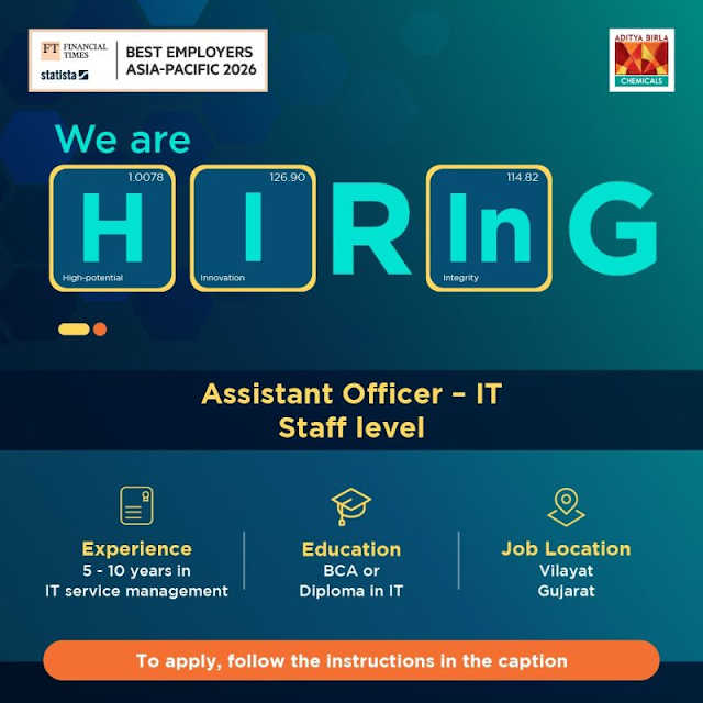 Aditya Birla Chemicals is hiring an Assistant Officer – IT (Staff Level) for its manufacturing facility at Vilayat, Gujarat.