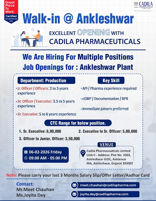 Cadila Pharmaceuticals Limited, a Great Place to Work® Certified organization, is conducting a Walk-In Interview 2026 at its Ankleshwar manufacturing plant for multiple Production Department roles.