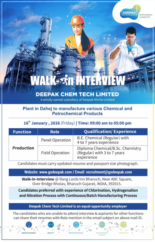 Deepak Chem Tech Limited, a wholly owned subsidiary of Deepak Nitrite Limited, is inviting experienced chemical professionals to attend a Walk-In Interview for its Dahej Manufacturing Facility.