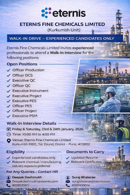 Eternis Fine Chemicals Limited (Kurkumbh Unit) invites experienced professionals to attend a Walk-In Interview for multiple openings across Production, DCS, Quality Control, Engineering, Safety, Projects, PES, and PSM departments. This is an excellent opportunity for candidates seeking stable, long-term careers in the chemical manufacturing industry.