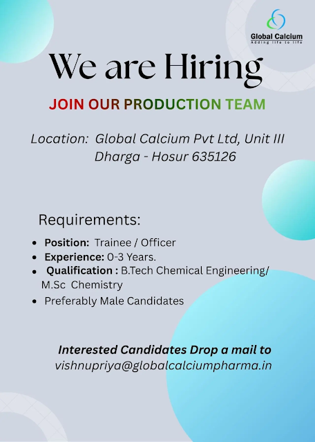 Global Calcium Pvt Ltd is inviting applications for Trainee and Officer – Production roles at its Unit III manufacturing facility in Hosur. This opportunity is ideal for Chemical Engineering and Chemistry graduates (freshers and early-career professionals) who want to build a strong foundation in pharmaceutical and chemical manufacturing operations.