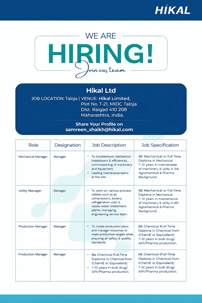 Hikal Ltd is hiring experienced Managers for its Taloja (MIDC) manufacturing plant in Maharashtra. These are full-time, permanent positions for professionals with strong industry experience.