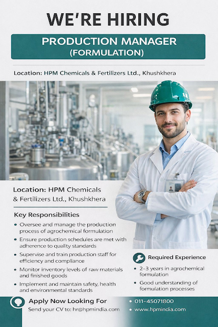If you’re an experienced agrochemical formulation professional looking to step into a leadership role, here’s a strong career opportunity. HPM Chemicals & Fertilizers Ltd is hiring for the position of Production Manager – Formulation at its Khushkhera, Rajasthan manufacturing facility.