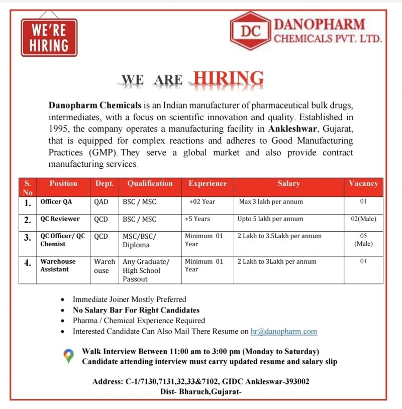 Danopharm Chemicals Pvt. Ltd. is looking for experienced professionals for various roles at their Ankleshwar facility.
