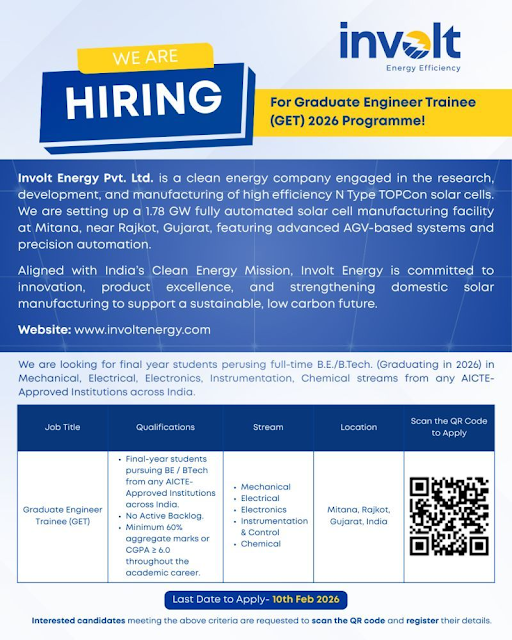 Involt Energy Pvt. Ltd. has announced its Graduate Engineer Trainee (GET) Recruitment 2026 for final-year BE/BTech students graduating in 2026.