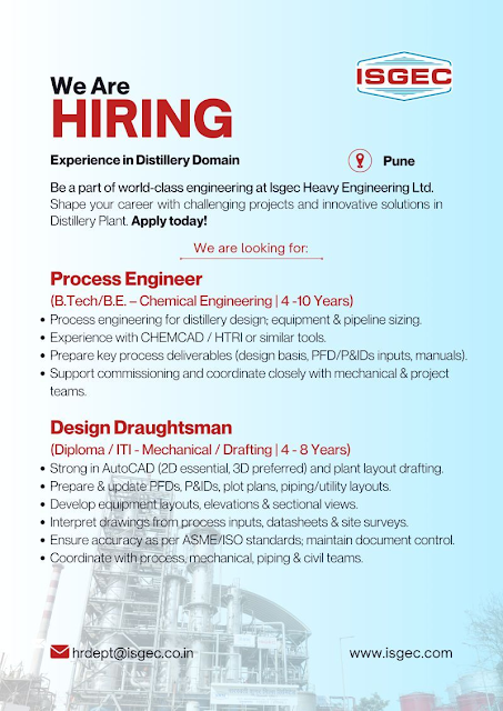 With decades of engineering excellence, ISGEC is known for world-class design capabilities, international standards compliance, and complex project execution. To support ongoing and upcoming distillery engineering projects, ISGEC is hiring experienced professionals for its Pune engineering office.