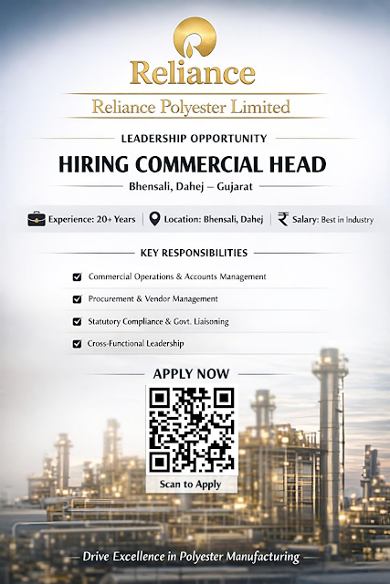 Reliance Polyester Limited invites applications from highly experienced commercial professionals for a senior leadership position at its manufacturing facility in Bhensali, Dahej (Gujarat). This role offers an excellent opportunity to lead strategic commercial functions in a world-class polyester manufacturing environment.