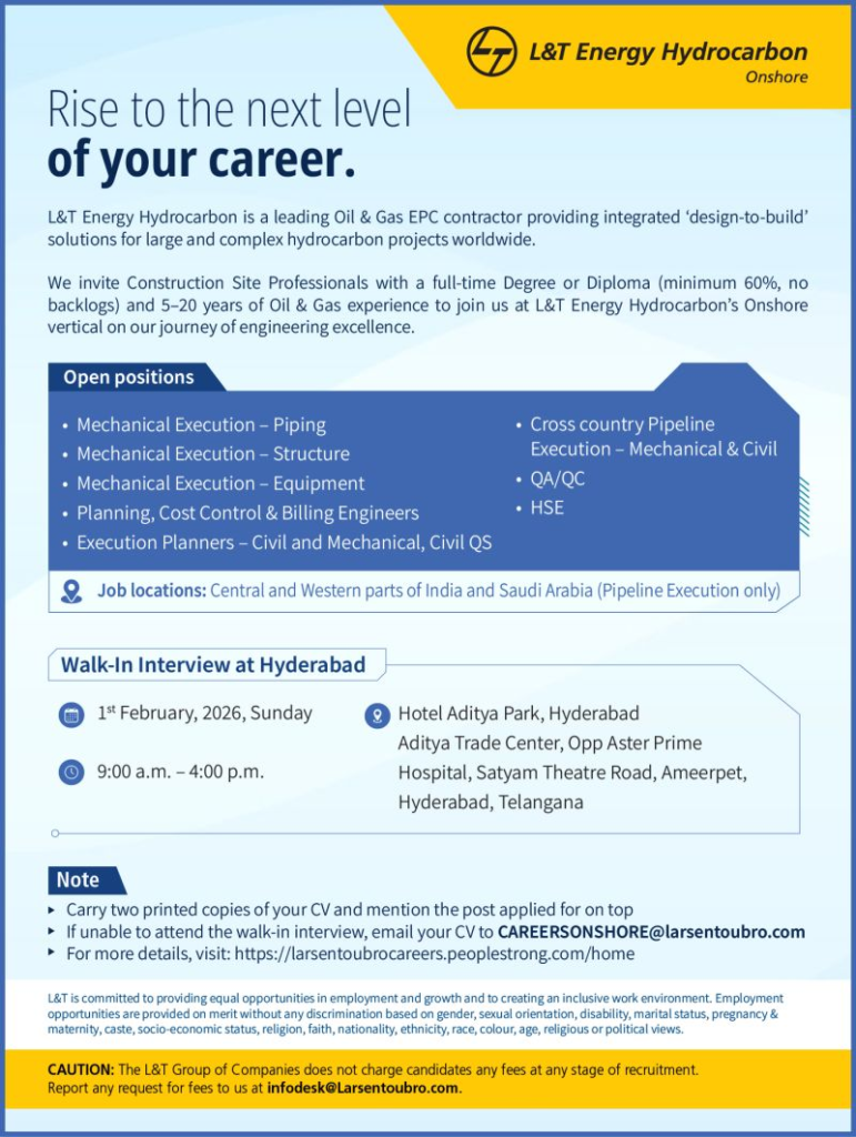 If you have solid Oil & Gas EPC experience and want to work with one of India’s most trusted engineering giants, L&T Energy Hydrocarbon’s Walk-In Interview on 1st February 2026 is an opportunity you should not miss.