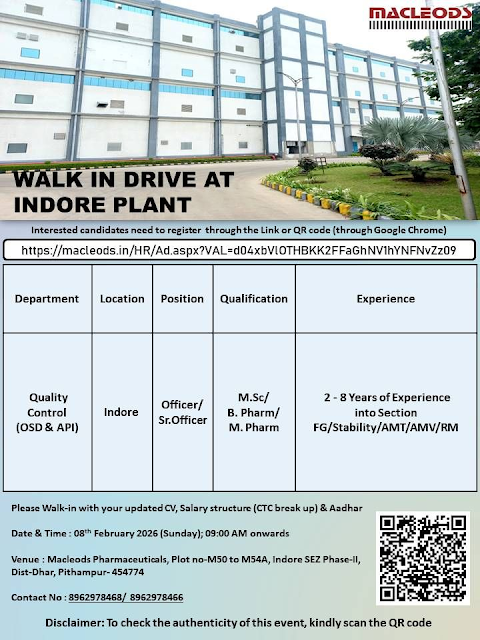 To strengthen its Indore SEZ (Phase-II) plant, Macleods is conducting a walk-in interview for experienced Quality Control professionals.