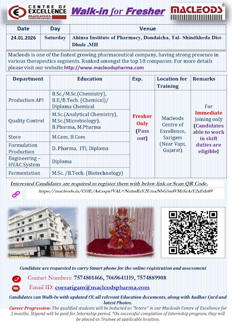 Macleods Centre of Excellence walk-in interview for freshers pharma jobs