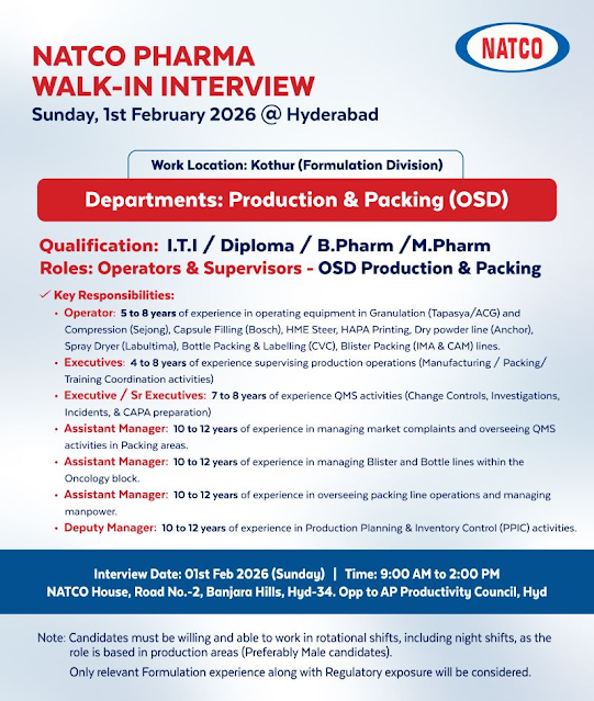 NATCO Pharma Walk-In Interview Hyderabad – Production & Packing Jobs