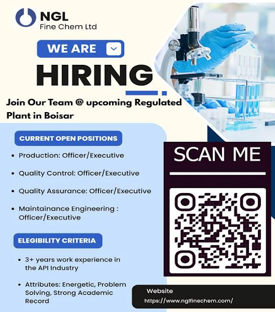 NGL Fine Chem Ltd is inviting applications from experienced pharmaceutical professionals for its upcoming regulated API manufacturing plant at Boisar. This hiring drive focuses on building strong teams across Production, Quality Control, Quality Assurance, and Maintenance Engineering, offering candidates the chance to be part of a new, compliance-driven facility from the ground up.