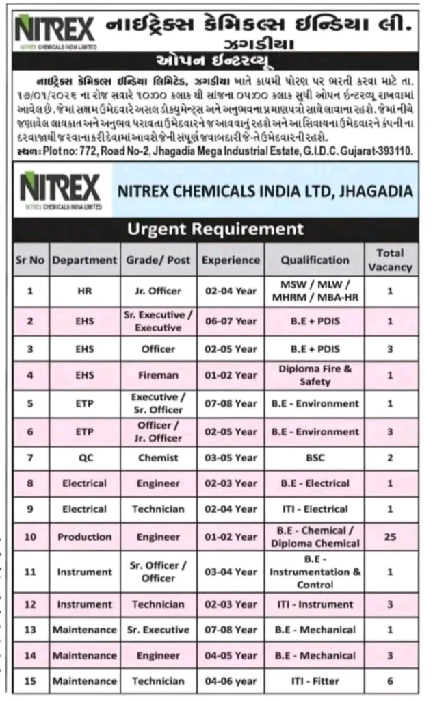 Nitrex Chemicals India Ltd. has announced a walk-in interview for permanent positions at its Jhagadia, Gujarat manufacturing facility. This hiring drive is open for experienced professionals from the chemical and process industry across multiple departments.