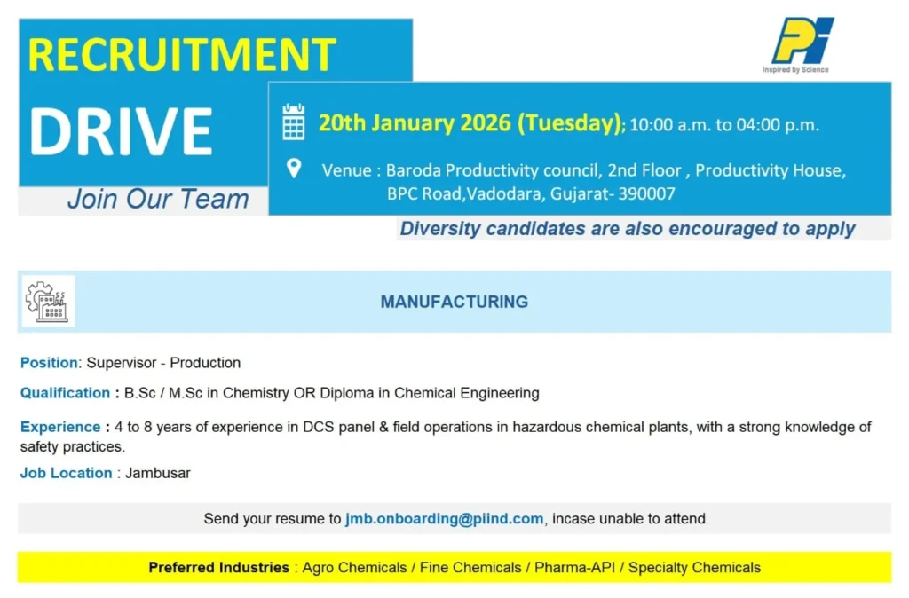 Looking for a stable chemical plant job with a reputed Indian company? Here’s an excellent opportunity for experienced professionals in production operations. PI Industries Ltd. has announced a Recruitment Drive 2026 for its Production Department at the Jambusar manufacturing site in Gujarat.