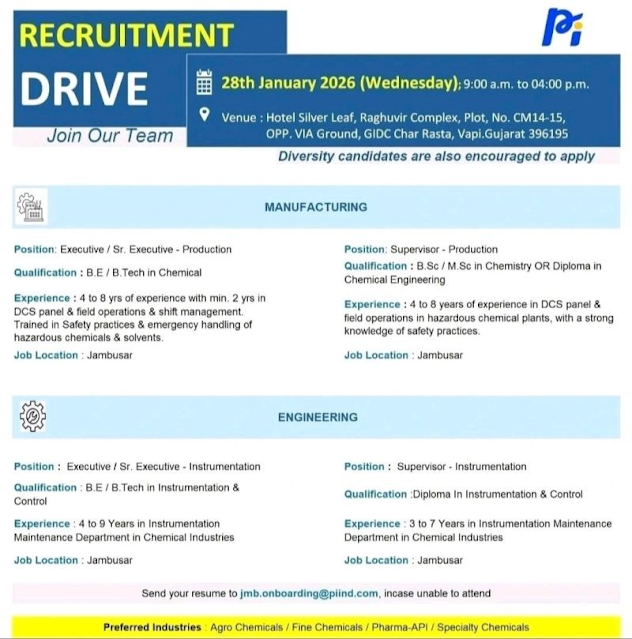To strengthen its manufacturing and engineering operations, PI Industries is conducting a Recruitment Drive 2026 to hire experienced professionals in Production and Instrumentation for its Jambusar manufacturing facility.
