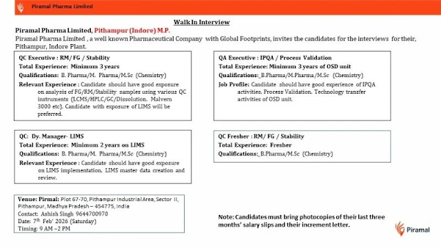 To strengthen its Pithampur (Indore) manufacturing facility, Piramal Pharma is conducting a Walk-In Interview in February 2026 for experienced professionals and freshers in Quality Control (QC) and Quality Assurance (QA).