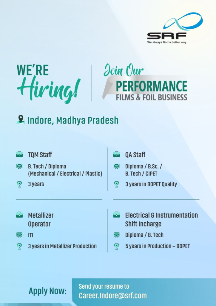 Looking to grow your career in industrial manufacturing and performance films? Here’s a strong opportunity with a global leader. SRF Limited is hiring experienced professionals for its Performance Films & Foil Business at Indore, Madhya Pradesh.