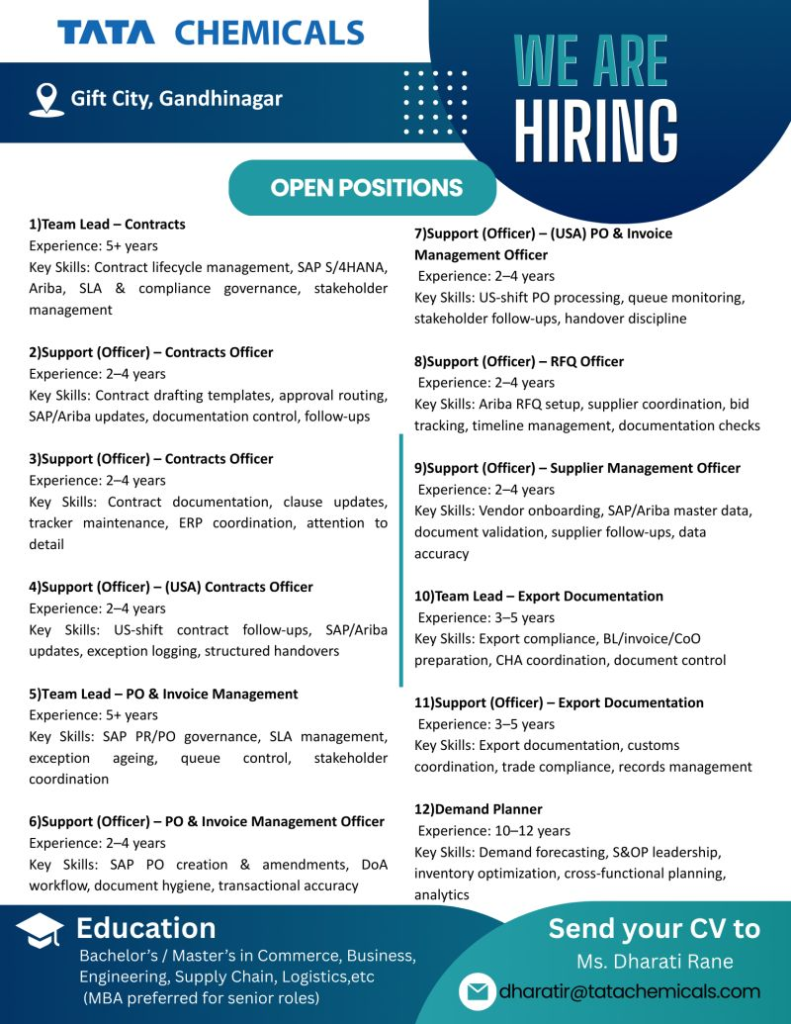 As part of its expansion at Gift City, Gandhinagar, Tata Chemicals is hiring experienced professionals across Contracts, PO & Invoice Management, RFQ, Supplier Management, Export Documentation, and Demand Planning functions. This is an excellent opportunity to build a long-term corporate career with one of India’s most respected organizations.