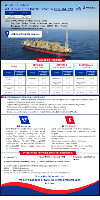 TOYO MODEC OFS India Private Limited is conducting a Walk-In Recruitment Drive in Bengaluru for experienced professionals in offshore engineering and FPSO projects.