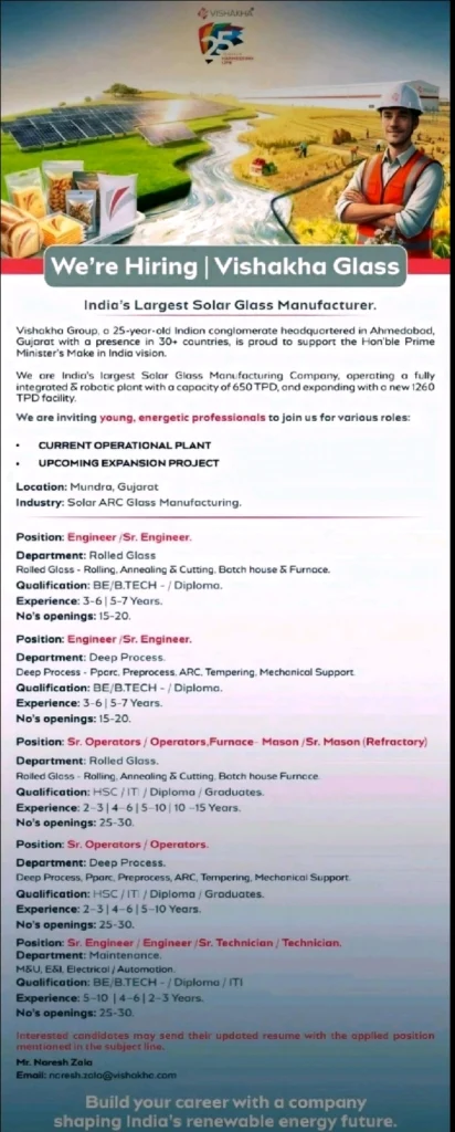 Here’s a mass hiring opportunity in India’s renewable energy manufacturing sector. Vishakha Glass, part of the Vishakha Group, is inviting Diploma, BE/B.Tech, ITI, and experienced professionals to join its solar glass manufacturing operations at Mundra, Gujarat.