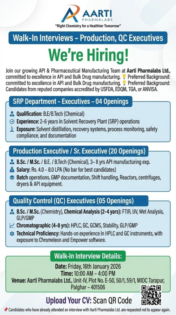 Walk-In Interview at Aarti Pharmalabs, Tarapur 2026 | Hiring for Production, SRP & QC Executives