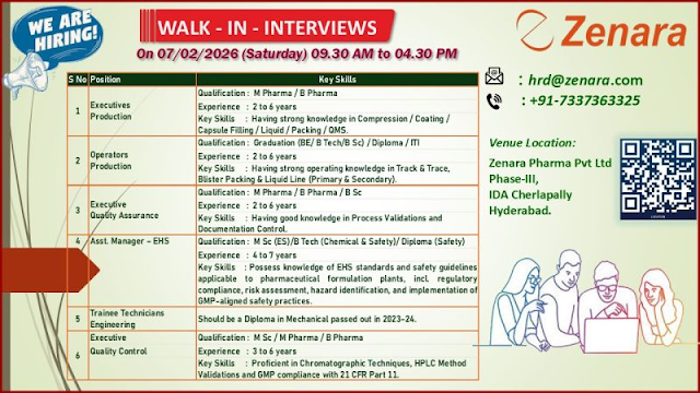 If you’re looking to advance your career in a regulated pharma environment with opportunities across multiple departments, don’t miss the Zenara Pharma Walk-In Interview 2026 in Hyderabad.