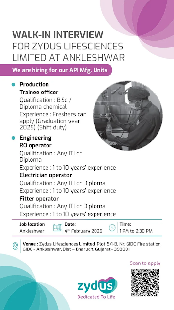 Zydus Lifesciences Limited is conducting a Walk-In Interview 2026 at its API Manufacturing Unit in Ankleshwar.